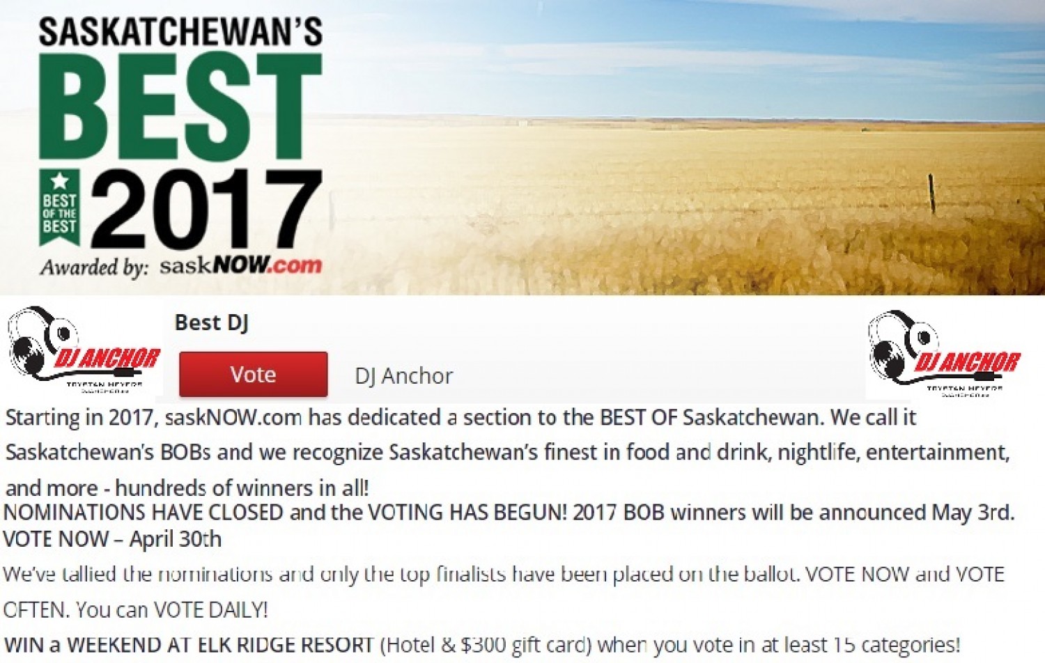Dj Anchor has been Nominated As "Saskatchewan's Best DJ" from SaskNow.com